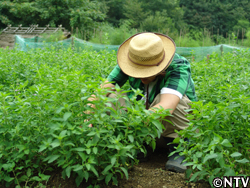 | それだけに正直薄荷を栽培することには、抵抗があった。 そして、植物としての薄荷を目にしたこともない私が本当に栽培できるのか。 そんな不安の中、薄荷は苗の状態から着々と生長し、あっという間に緑の葉で生い茂った。そんな畑に近づくと、1m以上離れているのに、薄荷のツーンとした香りが漂ってきた。さらに、葉を一枚採って手で擦ってみると、鼻が痛くなるほどの強い香りに思わず驚いてしまった。薄荷の香りは目覚ましの代わりになるかもしれない。 |