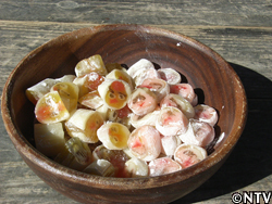 | そんな香りを保存するために、今回は収穫した薄荷を乾燥させ、蒸留を行い、薄荷油を 抽出した。これが、また薄荷飴の元になるのだが、薄荷の香りが凝縮しているだけに、鼻を近づけるなり、涙が出そうな強い香りがした。それにしても、油を抽出することで、香りが保存できるなんてすごい。 こんな薄荷油を入れた「薄荷飴」、私は小さい頃の悪夢が甦った。また辛くて口から出してしまうのではないかと。 |