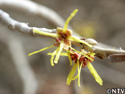 枯葉が残る里山でひときわ輝くのは黄色の「満作(マンサク)」。 「まず咲く」という意味からこの名前がつけられた。 |