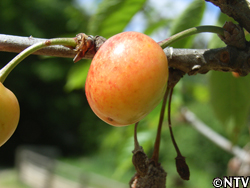 | そんな牧草を刈ってすっきりした地に、赤く光るものがあった。 それは「さくらんぼ」。 私は小さい頃から真っ赤な缶詰のさくらんぼが「さくらんぼ」だと思っていた。それだけに、村で本物の生のさくらんぼをはじめてみたときは、「こんなに綺麗なものなのかと」感動してしまったものだ。見た目も、私の大好きな桃に劣らず、とてもおいしそうに見えた。 |