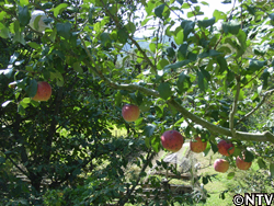 甘さと酸っぱさが丁度いい塩梅の「巨峰」。 ひと房しか出来なかったのはもう昔の話。今年は食べても食べてもなかなか減らない程の大豊作。 その上、真っ赤に色付き始めたりんごも巨峰に負けじと大豊作で、私のお腹は毎日大忙し。 |
