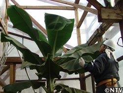 | この床暖房のおかげか、バナナは天井につくほどに伸びてしまった。そこで今度は急ピッチで増築、なんとか雪が積もる前に工事は終了した。気のせいかもしれないが、ハウスが広くなってバナナの葉が喜んでいるようにも見えた。 この冬を乗り切れば、きっと夏には黄色いバナナに出会えるだろう。 そう思うと今からわくわくしてきた。おなかいっぱいバナナを食べるためにも、なんとかして寒さから守らなければ。 |