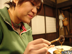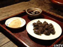 | しかし、その見た目には驚くしかなかった。 目の前にあったそれは黒のような緑のような、今まで見たことのない色の「わらび餅」だったからだ。 私の中の「わらび餅」のイメージは、白くて透明な餅イメージだった。でも村の「わらび餅」は黒色。明雄さんに聞いてみると、「わらび粉で作ったわらび餅はこういう色なんだ」と教えてくれた。 |