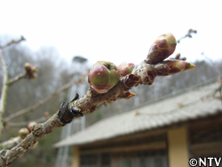 村の里桜の蕾もようやく全体が膨らみ始めた。 気のせいかもしれないけど、今年の蕾は大きく見える。あまりの蕾の大きさに枝から落ちてしまわないかと心配になるほど。 |