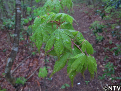 | 霧雨に濡れる瑞々しい若葉の色は、私の心の隅々まで染みわたり、優しく潤してくれるような気がした。 そんな若葉の中には、芽吹いたばかりの「モミジ」もあった。 秋に楽しむものという先入観のせいか、意外にこの時期にしっかりと見ることはなかった「モミジ」だけれど、紅葉したものにはない初々しさがあり新緑色のモミジも好きになった。 |