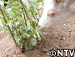 | そんな天気の中、さっそくヤギ一家を牧草地に連れていくことにした。 ヤギたちも久々の晴れ間が嬉しかったのか、すごい勢いで走り出した。彼らがまず向かった先は緑濃く生長した母屋前の畑。 中でも豆板醤の材料にも使った「空豆」はちょうど食べ頃を迎えており、「チャコ」はしきりに匂いを嗅いでいた。 |