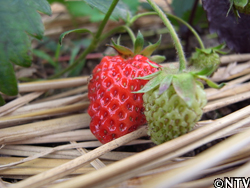 | しかし、私が気になったのは緑の空豆よりも真っ赤な「いちご」。 役場裏・ミツバチ巣箱前に開墾した自称「あんべ畑」の「いちご」に続き、こちらも収穫時を迎えていた。 真っ赤に染まった沢山の「いちご」。あんべ畑では数個しか食べられなかったということもあり、畑の初物「いちご」を明雄さんにも内緒で、少し食べてしまった。甘くて少し酸っぱくてとてもおいしかった。 |