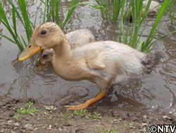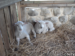| もう少しパトロールに集中してほしいと思いつつも、寄ってくる可愛らしいヒナ達を見るとつい許してしまう。 そんな中アイガモのヒナに負けないくらい可愛らしい仲間が村にやってきた。 それは「ヒツジの姉妹」。以前から毛織物を作りたいと思っていた私たちの願いが、今年ようやく第一歩を踏み出した。 |
