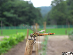 畑の支柱の上でひとやすみする「アキアカネ」。 すっかり村の生活に慣れてきたシロとテンの散歩の途中にふと気付いたが、 ここ数日間で、村のトンボが一気に増えた気がする。 そんな「アキアカネ」を見て、まだ梅雨明け前だというのに少し早い秋を感じ、少し驚いた。 |