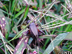 | 秋の音と言えば、もう1つ。「ヒグラシ」に代わって鳴き始めた「コオロギ」。つい最近まで「ヒグラシ」が鳴いていたと思いきや、いつの間にか里山の音の主役は「コオロギ」へと移り変わっていた。 秋の夜長に鳴く「コオロギ」は真っ黒な見た目からは想像できない綺麗な音を奏でる。「リリィーン」という柔らかい音は、なんとも言えない安らぎを与えてくれる不思議な力を持っている。 |