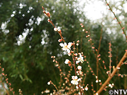 | ついこの前の大雪で竹が大きく折れ曲がりせっかく花が咲き始めた梅の木に覆い被さっていた。初めは、箒などの道具を使って積もった雪を下ろしていたのだがなかなかうまくいかず、結局竹の下に入り込み体全体で竹を揺らし、雪を振るい落とした。ただ、落ちてきた雪で梅の木を救出した頃にはびしょびしょになってしまったが、咲き始めた梅の花たちは守れることができた。 | ![]() |