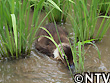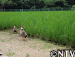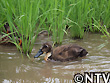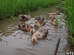 先日、デビューした10代目アイガモ隊は今日も分けつが進む苗の間を駆け巡っている。大きさもふっくらした体型がどんどんスリムになり、親ガモの体型に近づいている。僕も大分親代わりに近づけたのか、手を一発叩くだけで反対側にいるアイガモたちは田んぼを横断して全力疾走して来るようになった。 |