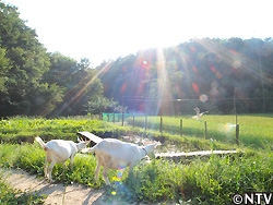 | 日差しが強い日は、昼過ぎにはヤギ一家を小屋に戻すようにしているのだが、ふぶきが一番抵抗して寄り道し、草を食べたがる。朝も朝で、僕が遠くにいても、早く出せと言わんばかりに大声で鳴く。今、一番活発なのがふぶきだと思う。 思えば、ふぶきも産まれてから半年が過ぎ、体も大人とそれほど変わらないほどにまで成長している。リンダのすぐ隣に並んだら、どっちがリンダでどっちがふぶきか見分けがつかないほど。 |