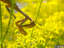 | そして、最近はカマキリもよく見かけるようになった。よく母屋の障子や扉に掴まり鎌を構えている。どうも壁が好きなようだ。見つけて、「久しぶりに見たなあ」と顔を近づけてまじまじと観察していると突然羽ばたいて飛んでいった。カマキリが飛ぶという事をすっかり忘れていた僕は、驚いてエビ反りにのけ反ってしまったが、倒れつつ目で追い観察していた。 | ![]() |