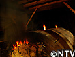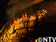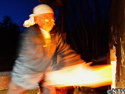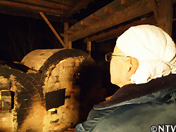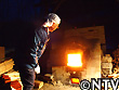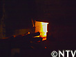 | この火守りを通して、1250℃という想像も出来ない世界を体験した。焚口を塞ぐ鉄板を開けると、炎の熱気が圧力となって体全体に押し寄せてくるのが分かった。あまりの熱気に頭に巻いていたタオルは焦げ、着ていたジャンバーが若干融かされたのかシワシワになってしまった。それ程の熱気なのだ。ついつい反射的に「熱い」と言う言葉が口から何度も出てしまった。明雄さんには何度も「そんなの当たり前だ」と言われたが、どうしても出てしまうのだ。焚口の奥では炎がメラメラと踊る。何だか、まるで生き物かのように感じた。 |