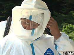 | そして、いよいよ村に到着。数ヶ月ぶりだけど、この2年、村をこんなに離れていた事がなかったので、何年も来ていなかったと思うくらい久しぶりな気がした。 村はとにかく、荒れていた。どこも雑草が生い茂り、僕の背丈くらいまで伸びていた。必ず聞こえていたヤギ一家、ヒツジ姉妹の賑やかな声は避難して他の場所にいる為に聞こえず静まりかえり、小屋の中はガランとして寂しげだった。 荒れた田んぼに畑、静まり返る動物の小屋、ジャングルと化した牧草地と殺伐とした現状は、僕がずっと見てきた村の光景とは180°違っていた。そして、それを見つめる僕たちは、白い防護服を身にまとう。本当に何もかもが異様だった。 |