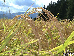 | 僕たちが借りた清さんの田んぼは、影響を受けず、新男米二米目は無事出穂の時期を迎えていた。新男米二米目は、交配5年目。まだ品種が安定していないので、高さや出穂の早さに違いはあるものの、順調に実っていた。そして、10月上旬、新男米二米目の収穫の時を迎えた。 新男米二米目の棚田からの眺めは絶景で、魚沼の土地、そびえ立つ山々が見渡せるが、頻繁に吹く風に稲が頭を揺らす度に、田んぼが海のように波立つ。まだ黄金に色づく前も綺麗だったが、色変わり後の黄金色の土地が波打つ光景は感動させられるほどだった。まさに米の名産地である南魚沼での稲刈りは、新男米二米目にとって、DASH村以外では初めて。お米の出来具合は良く、どの稲も頭をいつも以上に垂らしている気がした。清さんが言う通り、毎年悩まされたいもち病にもかからなかった。「風通し・日当り・土壌」、この3つの条件が揃っているとやはり違う。 |