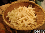 | 1. 甜菜をきれいに洗い、千切り(8o以下)にする。 ※青い部分には、有害性窒素が大量に含まれているため、できるだけ取り除く。 |