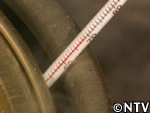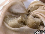 | 10.上澄みの糖蜜(ビートシロップ)を取り分け、沈殿している白い結晶のみサラシの布に入れる。 |