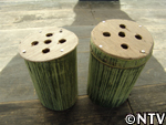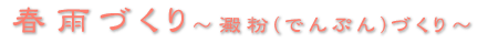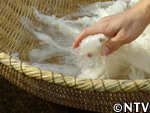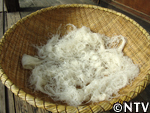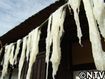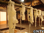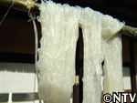 | 4.竿掛け 竿に掛ける場合は春雨を離すのではなく、厚く束ねるように竿にかけます。 8時間ほど冷却しながら、澱粉が老化するのを待ちます。 ※その間に表面が乾燥してしまうと、後で離れが悪くなってしまうので、つるす場合は風のない場所が好ましい。 |