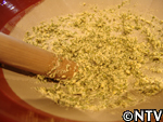 | 2. 緑豆の種が2倍以上の大きさにふやけたらすり鉢でよく潰し、特別の袋に通し、皮と実のかすを除去する。 |