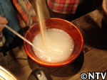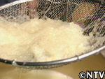 すり潰したものにさらに水を足し、たんぱく質などの他物質と澱粉を分離させる。 たんぱく質などの他物質は表面に浮きデンプンは底に沈殿するので、上澄みの部分を取り除いていく。 ※この上澄み液は生地づくりに使用するので、そのまま残しておく。 |