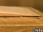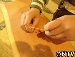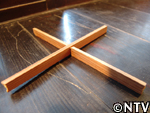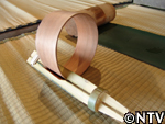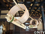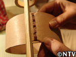 5.乾燥・接着・桜皮とじ。 囲炉裏の上で3日間乾燥させる。 曲げ輪同士が重なる箇所に穴をあけて桜の皮を通し、縫っていく。(曲げ輪完成)