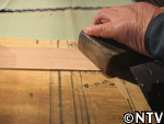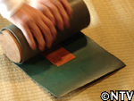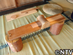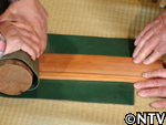 4.木材を曲げる。 ゴムがついたゴロと呼ばれる丸太で板を巻き込み、丸みをつける。