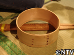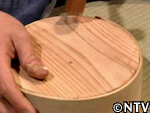 5.蓋・底入れ。 隙間ができないよう、円盤板をヤスリがけしながら、曲げ輪に蓋・底のそれぞれの板を窮屈に叩き入れ、釘がわりのつま楊子で固定したら完成。 今回、本体の底は十字の木で組み上げ底式にし、セイロにも使えるようにした。