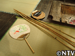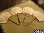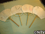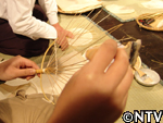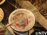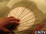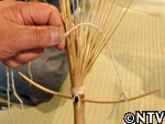 3.穴あけ 節に近い柄の部分に穴をあけ、柄の空洞部分に柳の枝を詰める 4.糸で骨を編む 村の綿の糸で右・左と交互に骨を編んでいく 5.弓入れ 弓竹を削って調整し穴に入れる 6.目拾い 弓竹に一時的に糸を結びつけ、目拾いというねじれをとる作業をおこなう