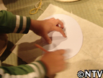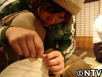 8.本窓づくり 弓竹を折り曲げ、骨の両端に接触する部分で糸を結びつける。 型に合わせながら調整する。弓の部分に重なった骨は折る