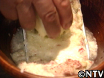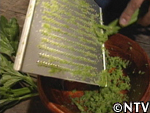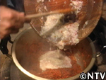| 7. 最後に酢と塩を入れ煮詰め、布でこせば出来上がり。絞ったものは瓶に詰め1ヶ月程熟成させる。 ※熟成後、澱粉でトロミをつけたり、砂糖を焦がして黒味をつける。 |