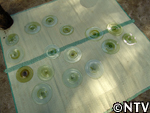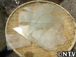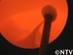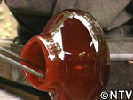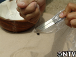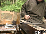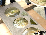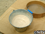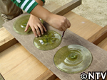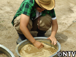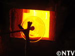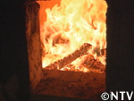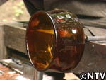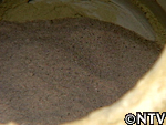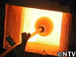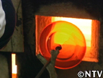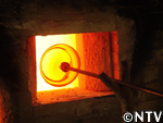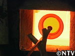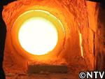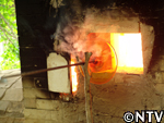 | 3.原料投入 鉄を取り除いた村の砂と前回同様、焼いた重曹、貝殻石灰を混ぜて、ルツボの中に原料を投入する。 加工に充分な柔らかさにするには1300度以上が必要となる。 しかし、大きい窯とあって1300度までなかなか上がらず、薪をくべる熱い作業が2日間続いた。 そのおかげもあって、無事加工できる柔らかさまでになった。 |
