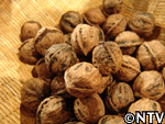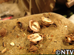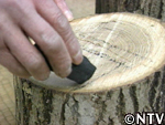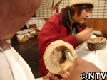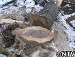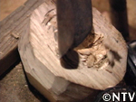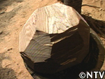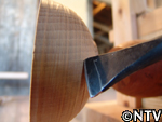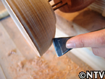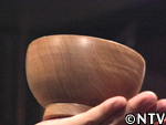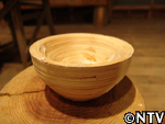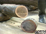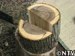 | @木材選び 里山にお椀の材料探しに出る。 お椀を作るにはある程度の太さが必要。直径33cmの赤松はあったが、松は松脂(まつやに)が出てしまい、加工ができない。かといって、コナラだと木自体が堅いため、形成しにくい。 そこで、明雄さんの山を見せてもらうことになった。そこには、直径40cmのオニグルミの木があり、オニグルミは木目も出やすく、木自体も軽く柔らかい為、この木でお椀を作ることになった。 |