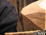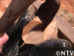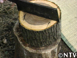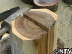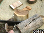 | A荒型取り(あらがたどり) 伐採した木材から荒型をとる作業。 のこぎりで丸太を20〜30cmの幅で切り、ナタと木槌で叩きわって形成していく。ここで、六角形に木取りをし、お椀の原型をつくる。 |
