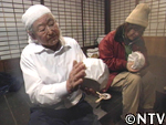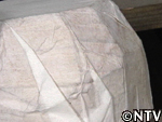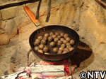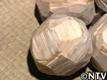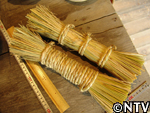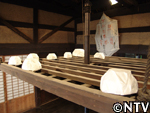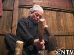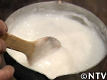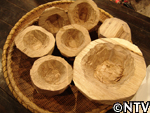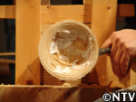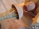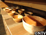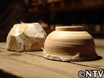 | D乾燥 急激な乾燥による、割れや歪みを防ぐために、米糊を隙間に埋め込むように塗り、和紙で覆う。 米糊は、昨年収穫した「男米」のクズ米を鍋で焦げないように、ゆっくり煮詰めたもの。 これを、囲炉裏の上でゆっくりと1ヶ月ほど燻煙乾燥させる。 この段階で、充分に乾燥させることで、完成後に歪まないお椀をつくことができる。 |