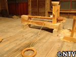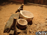 | C中切り(なかぎり) 中切りを使って、お椀の内部を荒削りする作業。石、板、杭で作られた中切り台という台の上で、足で挟んで作業をする。 ここでも、同じ場所に刃物を下ろすのがポイント。 |