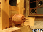 | B外彫り(そとぼり) ひらちょうな(いわゆる平らな削り刃に作られた手斧)という重さ1.2sの道具を使って、八角形をイメージし外側の部分を削る。できるだけ同じ場所に刃を当てることがポイント。 |
