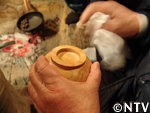 | F塗り 汁漏れを防ぐために、最後にクルミの油でコーティングする。 一般的には漆で表面をコーティングするが、今回村では、昔より家具材でも使われてきた天然のコーティング剤として、クルミの油を繰り返し塗った。 |