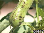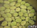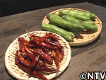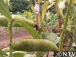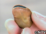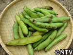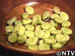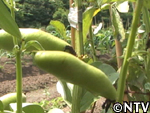 | 2007年7月 空豆収穫 大きく育った実の重みで、上を向いていた空豆は下へと垂れ下がってきた。 試しに1つサヤの中をあけてみると、大きく膨らんだ空豆が3つ入っていた。 ザルいっぱいの大収穫で、豆板醤づくりには十分な収穫量となった。 |