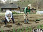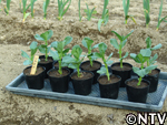| 2007年4月 空豆の定植 1ヶ月で空豆はぐんぐん伸び、苗の高さが18センチ程まで生長した。 ここからは、根を生やすために畑に定植する。 小さな穴をあけて、50cmの間隔で植えていく。全部で20個の苗を定植した。 |