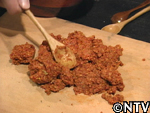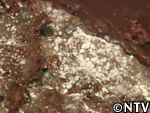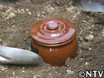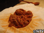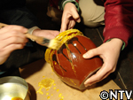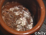 | 2007年 12月 白カビ撤去 熟成期間に入って2ヶ月経った頃、白いカビが発生してしまった。まずは、急いでカビの部分を撤去し、これ以上カビが生えないように男酒で殺菌をし、カビの原因となる空気を防ぐため、チーズの時にも利用した蜜蝋で瓶の隙間をコーティングした。 |