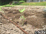 | 7月上旬 定植 苗も15cmに生長し、畑に定植。 エゴマの苗の生長はとても早く4・5日遅れただけで30cm ほどに伸びてしまう事もあるので時期を逃さないことが重要。枝が伸びることを考え畝幅、株間は広めにとり、全部で200株の苗を植え付けた。 |
