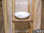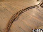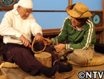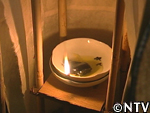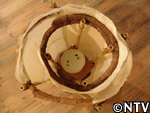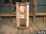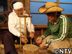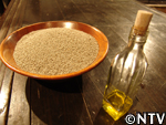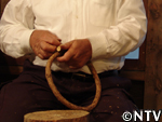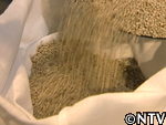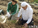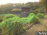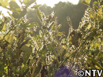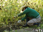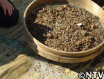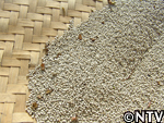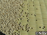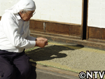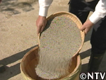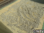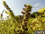 | 10月中旬 刈り取り/乾燥 葉や茎が黄色く変化した時が収穫の目安。実も白色から灰色に変わり、さっそく、根元から刈り取る。 刈り取ったら、立てかけてそのまま乾燥させる。 最後に、鳥に実を食べられないようにネットをかけた。 |