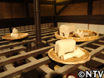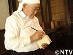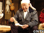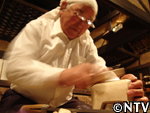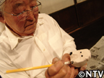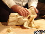 | 3.型づくり まず木型に、後で紙が剥がれ易いよう油を塗り、5枚重ね張りした紙を型に押し付け成型する。のりを手に付けつつ、和紙をのばし、押しつつ、こすりつける様な要領で貼り付けていく。頭と胴体を木型に貼ったら、一晩囲炉裏の上で充分乾燥させる。 |