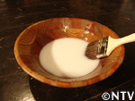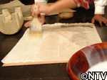 | 2.のり付け 障子和紙を二次利用する。 一枚一枚のりを付けながら全部で5枚の和紙を張り重ねる。 |