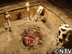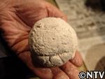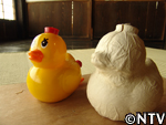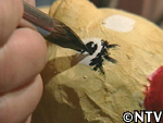 | 8.仕上げ 糸と針を使い、首と胴体をくっつけていく。バランスをとるため、首の端部分に石ころをつめ、バランスをとる。(このバランスがうまくとれていないと振り子のように首が動く張り子が作れない。ポイントは頭と首の長さが1:1であること。) |