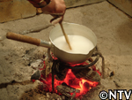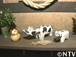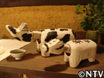 | 7.絵付け 豊作祈願ということで、干支の牛と村長のだるまを作り、黒色は村で作った墨。赤色は、紅花。村長の黄色も紅花の色を利用した。村長のだるまの片目だけは豊作祈願が実った時に書き込むために残した。 |