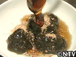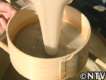 その後、水を加え手で揉んでデンプン成分を抽出し、フルイにかけて液体と地下茎のカスを分離させる。