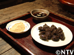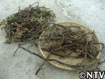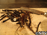 中々うまく掘れず地下茎が切れてしまう中、明雄さんは4本の葉が地下で繋がった約4mの地下茎を収穫していた。4時間かけて収穫したわらびの地下茎は全部で2s。 |